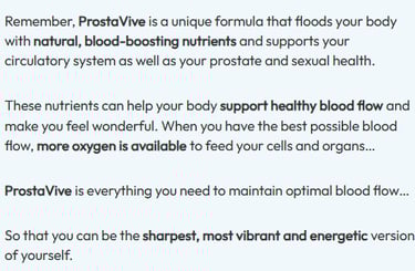Thanks to the powerful nutrients in ProstaVive, you can boost your prostate’s performance by optimizing its internal cellular activity and blood flow, helping you enjoy powerful, youthful flow and increased sexual activity…